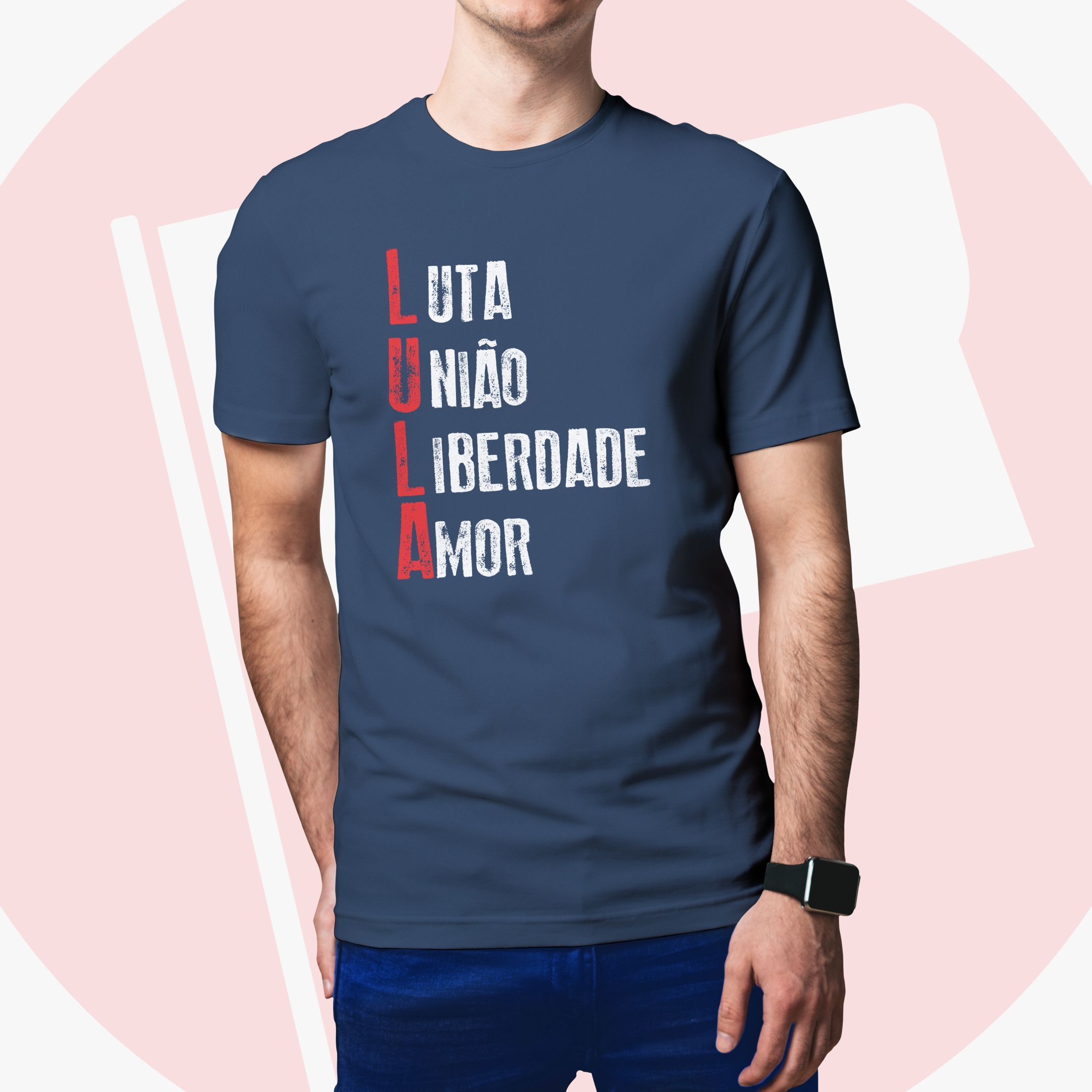 A Camiseta Lula, traz quatros palavras que nós militantes temos que ousar e nos vestirmos, mas não somente como uma peça de roupa e sim uma forma de viver, Luiz Inácio sempre foi um exemplo vivo que isso é possível, esta camiseta é um produto nacional, na cor azul marinho e em malha 100% algodão no fio 30/1 penteados.